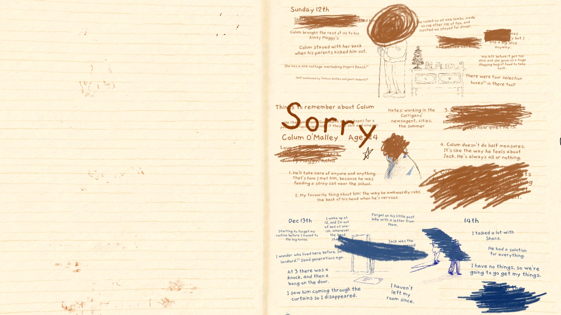 Unlike the popular forms of visual novels in the west based on dating sims and choose-your-own-adventure novels, you do not make choices in the vast majority of If Found. Your primary mechanic is erasure. If Found… tells two running narratives, the primary narrative in the form of a diary. Your primary interaction is to read a section of the diary, erase any marks scratching things out, and then to erase the text and drawings in the diary themselves. The act feels violent. It feels intrusive. I love this mechanical choice. But, no, it’s not very gamelike.