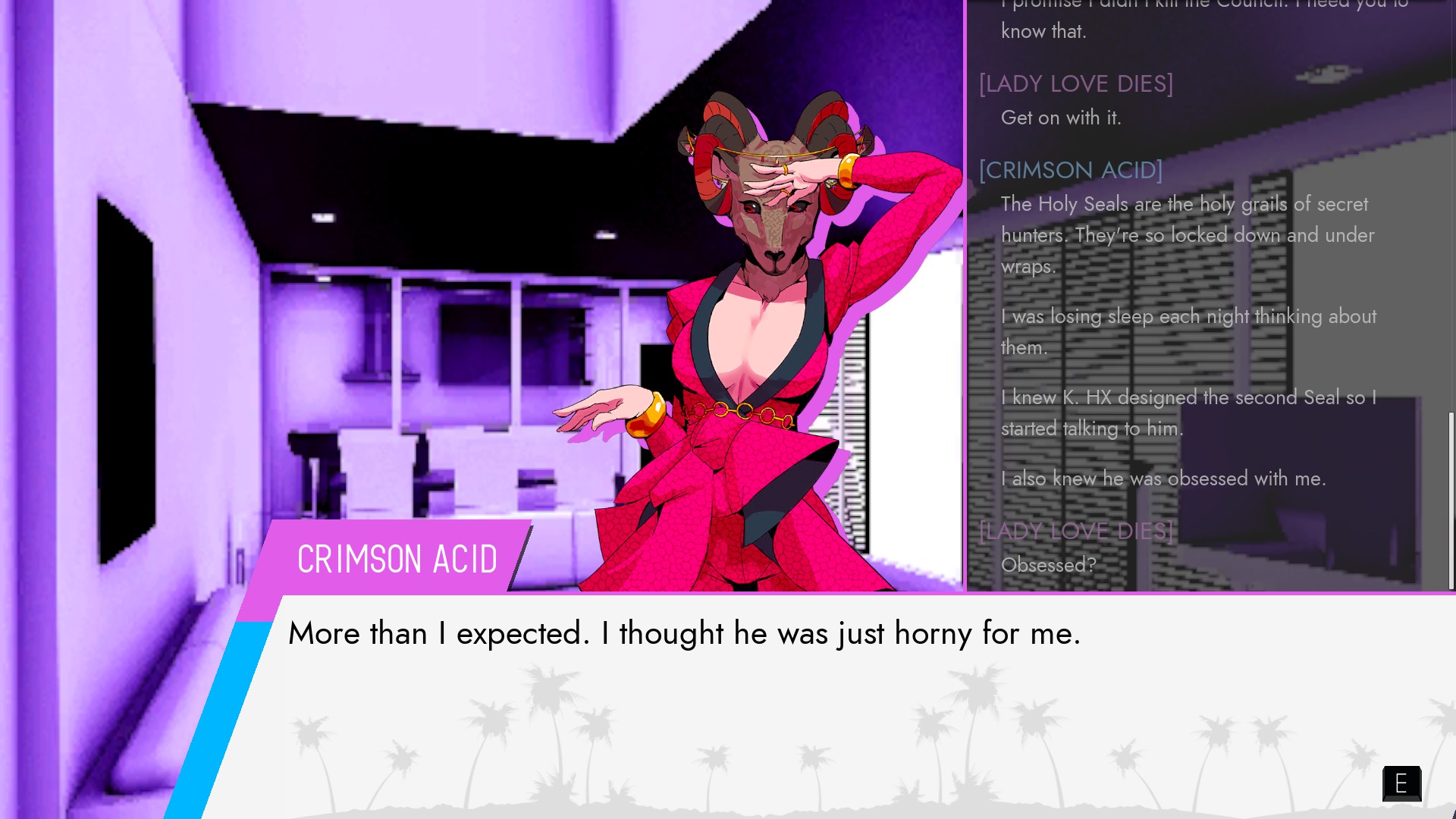The moment I heard about the vaporwave murder mystery where you can initiate the final court case five minutes into the game, I knew it was a game I was going to *have* to play before I began considering Game of the Year. The expectations were high for the story of Lady Love Dies, the exiled Investigation Freak who is called back to Paradise Island when the entirety of The Council is murdered just before the Perfect 25th Sequence. Your old friends, the members of The Syndicate of immortals who are trying to resurrect old alien gods, seem eager to sweep things up before you do your job. Lot of secrets in the time you’ve been exiled. Lots of old friends to catch up with.